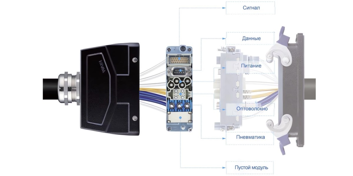 - Идеальная интеграция в одном корпусе соединителей питания, передачи сигналов, оптоволоконных и пневматических соединителей.